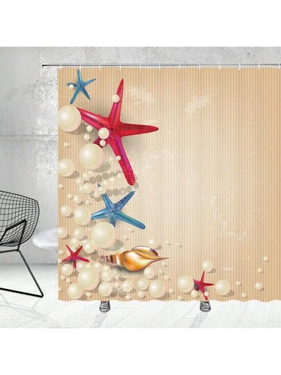 1pc Vacation Style Bathroom Shower Curtain With Soft Pink Seashell, Pearl, Starfish Design And Hooks - Peach - View 1