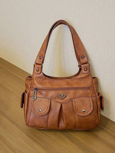 1pc Vintage Large Capacity Handbag, Vintage PU Shoulder Messenger Bag, Women's Casual Tote Bag And Wallet - Brown - View 1