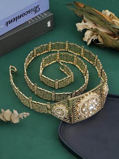 1pc Vintage Luxurious Women's Waist Belt With Rhinestone & Adjustable Length Jointed Wavy Chain Design For Wedding Bridal Jewelry Accessory - Gold - View 1