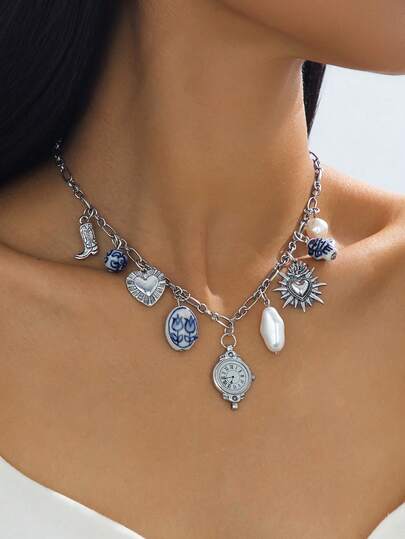 1pc Vintage Multi-Element Gold-Plated Pendant Necklace With Assorted Prints Including Pearl, Clock, Transparent Oil Drop, Ceramic Patterns - Necklace - View 1