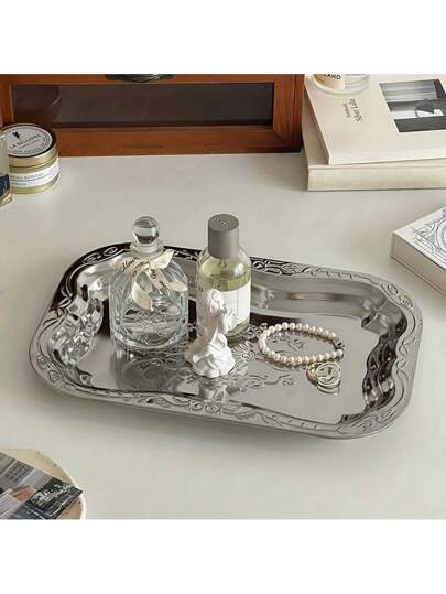 1pc Vintage Silver-Plated Rectangular Jewelry Tray Stainless Steel Fruit & Food Tray: Perfect For Jewelry, Cosmetics, Or Small Desserts - Suitable For Desktop Use Storage Tray Gifts For Women Back To School - Silver - View 1