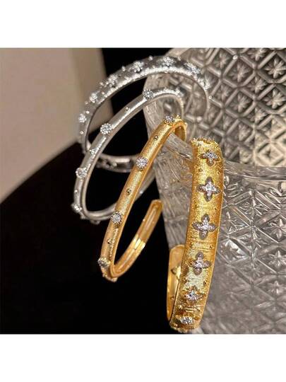 1pc Vintage Style Four-Leaf Flower Pattern Bangle, Luxury Rhinestone & Brushed Metal Design For Women - A - View 1