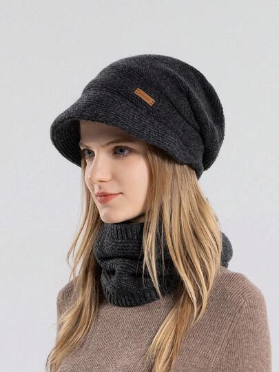 1pc Winter Thickened Beanie For Women, Outdoor Warmth Knitted Hat With Wide Brim, Postpartum Cap - Black - View 1