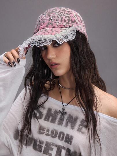 ROMWE Kawaii 1pc Women's Leopard Print Rhinestone Star YK2 Baseball Cap - Pink - View 1