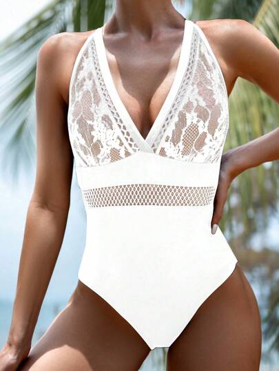 SHEIN Swim 1pc Women's Solid Color Neck-Tie Halter Swimsuit, Fashionable For Summer - White - View 1