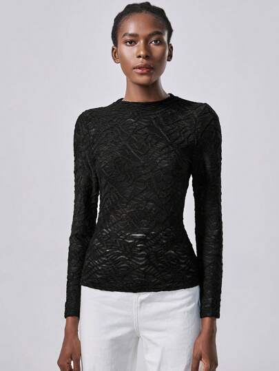Chiquease 1pc Women's Textured Ruched Long Sleeve T-Shirt, Black, Knit Texture Ruching, Regular Fit, Casual Commuter Wear - Black - View 1