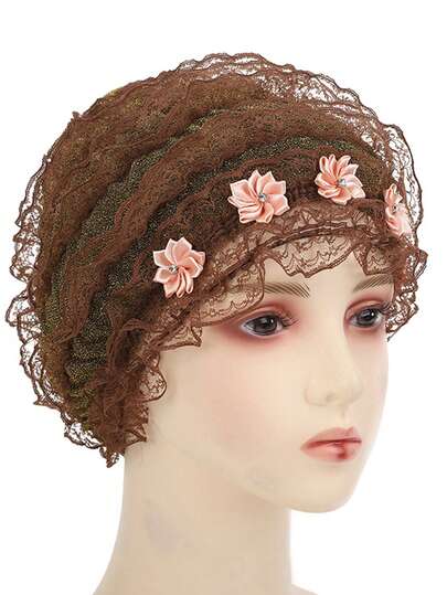 1pc Women'S Cap With Scarf And Lace For Mom, Headwrap, Headscarf, Beanie, Headband, Turban Cap - Coffee Brown - View 1