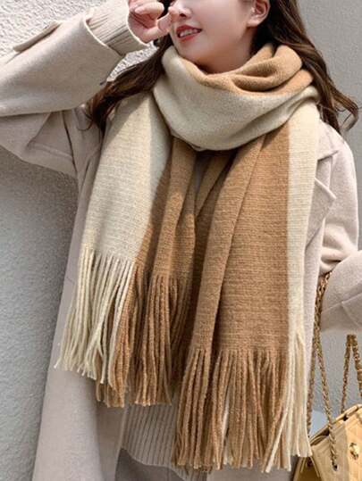 1pc Women's Faux Cashmere Double-Sided Colorblock Tassel Scarf Shawl, Soft And Comfortable, Suitable For Daily Use And Couple Scarf - Khaki - View 1