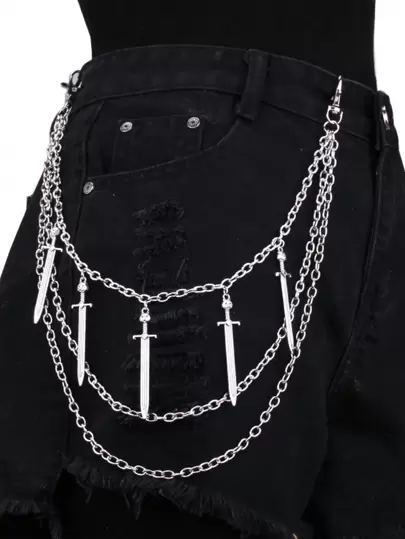 1pc Women's Silver Multi Layered Metal Chain Sword Pendant Alloy Pants Chain, Fashionable, Skirts, Suitable For Daily Wear Street Halloween Summer, School Fall, Autumn, Halloweenshorts - Silver - View 1