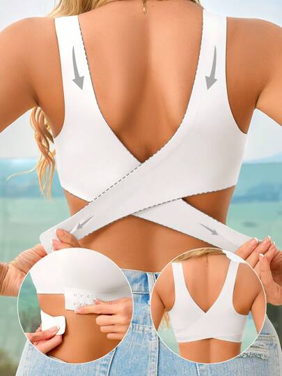 1pc Women Seamless No Padding Elegant Breathable Comfortable Crisscross Back Bandeau Bra - White - View 7