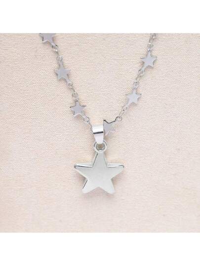 1pc Women Stainless Steel 3D Pentagram Necklace, Minimalist Street Style Everyday Wear Design, Star Stainless Steel Chain Clavicle Necklace - Silver - View 1