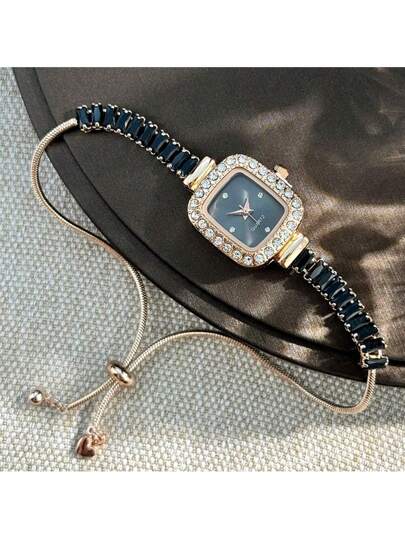 1pc Women's Black Cubic Zirconia Embellished Adjustable Bracelet Watch, Square Alloy Case, Rhinestone Indexes, Simple Quartz Movement, Elegant Design - Black - View 1
