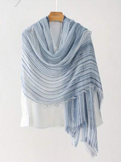 1pc Women's Fashion Simple Striped Ombre Crinkle Tassel Polyester Scarf, Casual Versatile Hijab Windproof Sunscreen Shawl - Multicolor - View 1