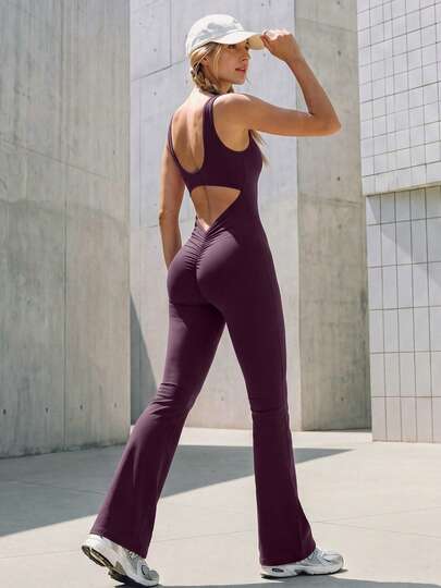 1pc Women's Fashionable Seamless Yoga Jumpsuit, Sexy Hollow Back Design Dance Workout Outfit, Soft & Comfortable Sports Unitard - Purple - View 1