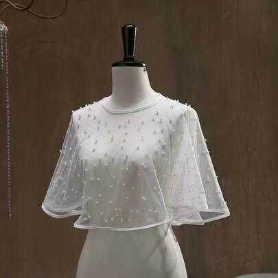 1pc Women's New Arrival European And American Elegant Faux Pearl Bridal Headpiece, Graceful Faux Pearl Tulle Polka Dot Veil - White - View 1
