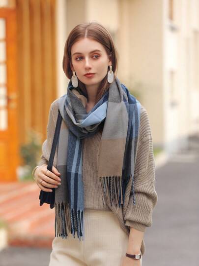 1pc Women's Plus Size Plaid Multicolor Tassel Detail Faux Cashmere Warm Fashion Scarf Shawl, Suitable For Daily Wear - Multicolor - View 1