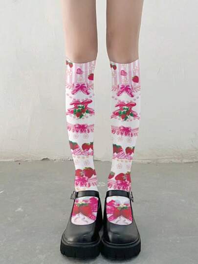 1pc Women's Strawberry Print Thin Long Tube Stockings For Spring And Autumn - Multicolor - View 1