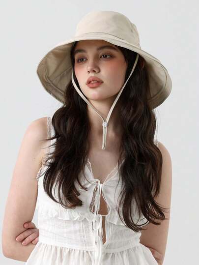 1pc Women's Sun Hat, Gardening Hat, Wide Brim Ponytail Hat, Beach Sun Hat, Breathable Material, Summer Sun Hat, Foldable Brim, Outdoor Solid Color Drawstring Hiking Hat - Width - View 1