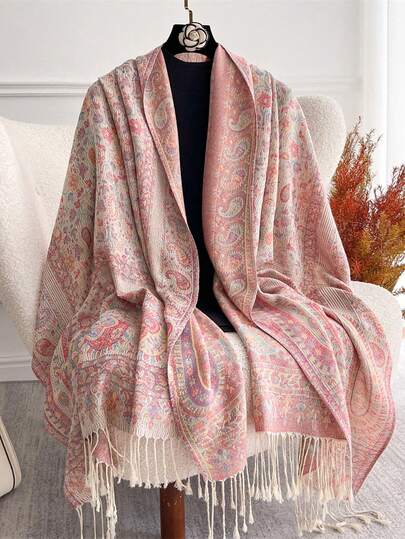 1pc Women's Vintage Jacquard Paisley Bohemian Style Long Wool Blend Scarf, Flowing & Soft, Faux Cashmere Shawl, Suitable For Daily Wear, Travel, Autumn/Winter, New Year Gift - Pink - View 1
