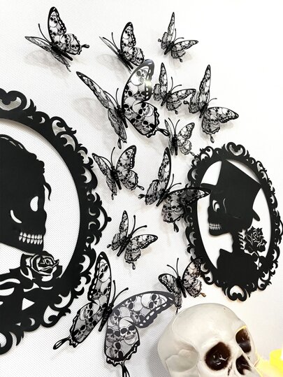 1set 12pcs 3d Skull Design Decoration Butterflies Sticker,Stickers,Wall Decal, Vinyl Decal For Home Decorations,Spring Decoration Items Refresh Your Home,Rama Decoration Stickers Halloween Decor Room Decor Halloween - Multicolor - View 1