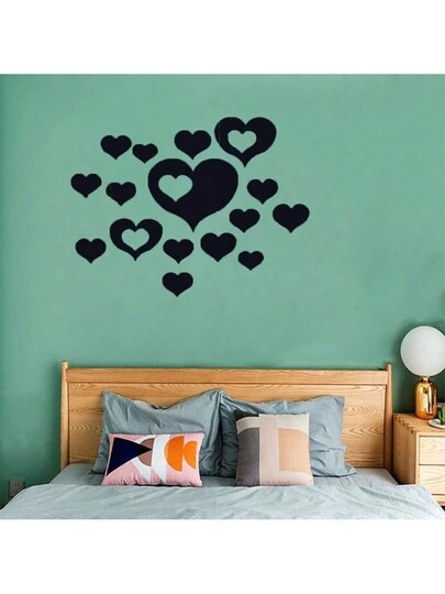 1set/16pcs Black Heart-Shaped Wall Decoration Three-Dimensional Acrylic Mirror Wall Stickers Living Room Bedroom Creative Background Decorative Painting Self-Adhesive Mirror - Black - View 1