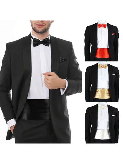 1set Men Solid Color Fashionable Cummerbund Bowtie Pocket Square Set, Business Formal Cummerbund Belt Clothing Accessory Combination Halloween Fall, Autumn, Halloween Autumn-Winter Accessories,Suitable For Teens, Youth,Men,Casual, Outdoor, Athletic, Vacation, Graduation Gifts, Birthday, Daily Wear Halloween, Casual, Business, Street, Boho, Western, Outdoor, Gift For Men, Husband, Boyfriend, Father, Dad, Christmas - Multicolor - View 1