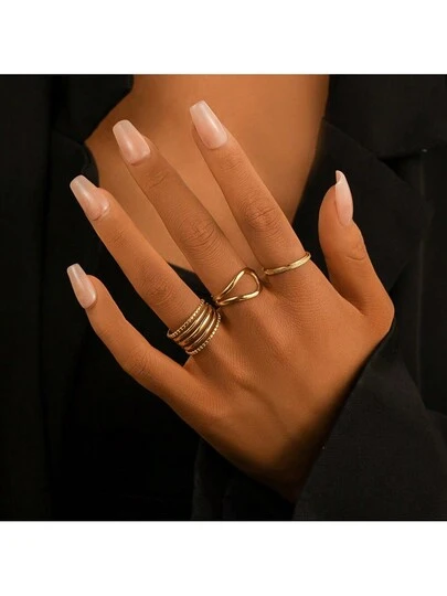 1set Women's Stainless Steel Gold-Tone Hollowed Out Line Design Ring Set (3pcs) - Yellow Gold - View 1