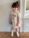 SHEIN 2pcs Infant & Toddler Girl Sports Casual Burgundy Digit Print Contrast White V-Neck Tee And Floral Grey Print Pants Set, Suitable For Daily Wear, Game Watching, Streetwear Toddler Summer Clothes