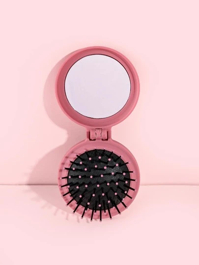 Pink Multifunctional Cushion Hair Brush 1pc Plastic Classic Round Portable Foldable Mirror Comb 2-In-1 For Wet And Dry Use For All Hair Types, Hair Brush/ Hair Comb, Hair Brush, Comb, Hair Tools, Hair Products And Accessories For Barber Salon Beauty Back To School, Travel Holiday Essentials, Hair Accessories For Women, Brush, Wooden Comb, Hair Brushes - Pink - View 1