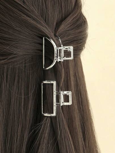 2 Pcs Women's Small Silver Rectangular Semi-Circle Metal Hollow Out Hair Clips Summer - Silver - View 1