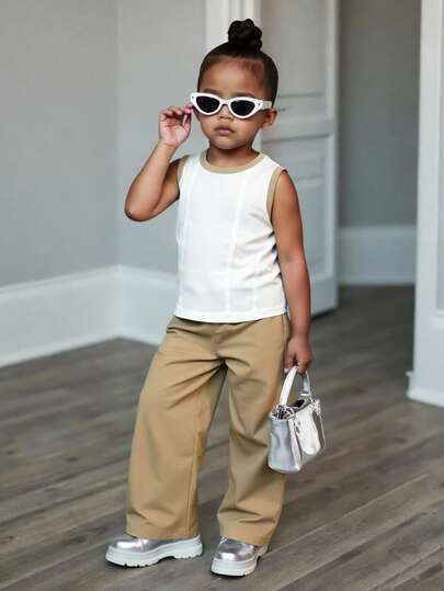 2 Pieces Set: Girls' Casual Knitted White Top & Khaki Loose Pants - Summer Outfit, Young Girl' Daily Comfortable Clothing - Multicolor - View 1