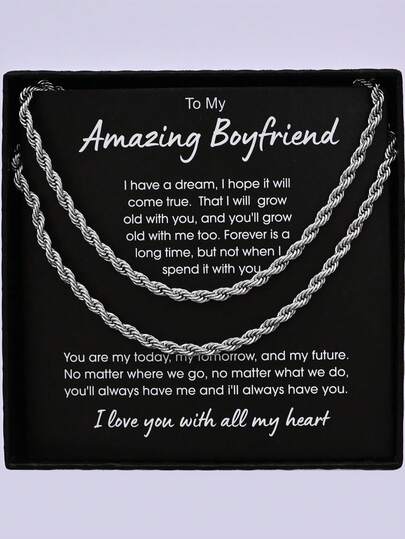 2 Pieces Silver Men's Minimalist Hip-Hop Fashion Stainless Steel Necklace Bracelet Set Blessing Paper Card Box Gift For Husband Man Boyfriend Other Half Gift - Silver - View 15