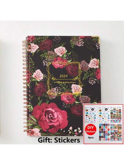 2024 Planner Notebook A5 Size With Flip Index Page, Weekly Calendar, Yearly Calendar, Coil Binding, And Floral Cover Design - Black - View 1