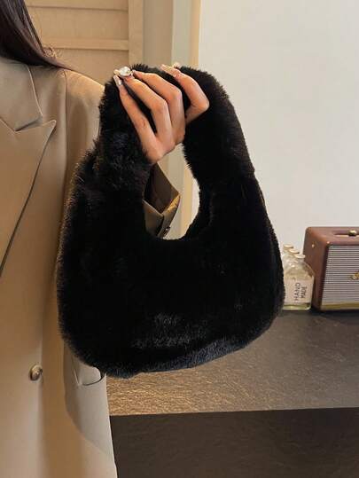 2025 New Plush Small Handbag For Women, High-Quality Versatile Fuzzy Tote Bag, Fashionable Student Shoulder Bag - Black - View 1