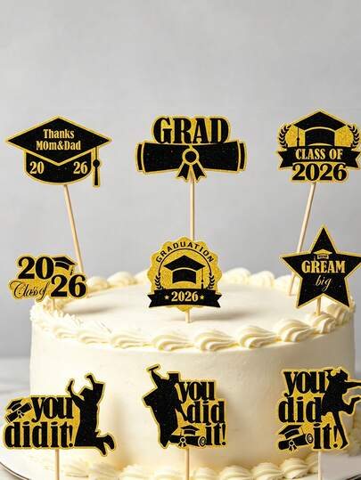 Thiệp trang trí bánh kem mừng tốt nghiệp năm 2026 - Mũ tốt nghiệp cử nhân màu đen và vàng lấp lánh / Lời nhắn nhủ ý nghĩa / Số / Lời cảm ơn bố mẹ - Thiệp trang trí bánh kem mừng tốt nghiệp.