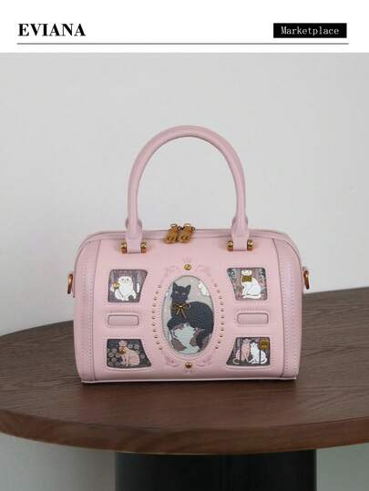 2026 Niche Design Fashionable New High-End Luxury Women's Handbag, Y2K Retro Tarot Card Rivet Oil Painting Cat Boston Pillow Bag, Dopamine Tote Shoulder Crossbody Bag, Commuting Large Capacity Street Style Bag - Multicolor - View 1