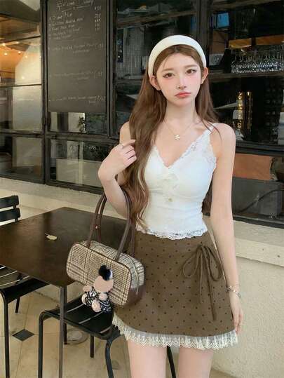 2026 Spring/Summer Khaki Polka Dot Lace A-Line Mini Skirt - Elegant Sweet Lace Trim Tie Waist Skirt, Suitable For 2026 Retro Polka Dot/Valentine's Day/Easter/Mother's Day/Evening Date/Coffee Gathering/Weekend Date - Brown - View 1