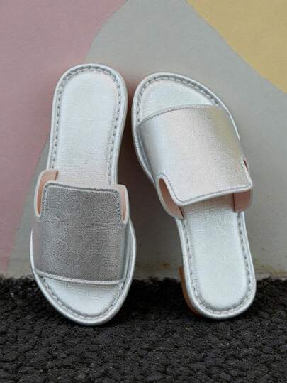2026 Summer 3-12 Years Old Girls Silver PU Leather Flip-Flop Sandals, Non-Slip Soft Bottom Open Toe Princess Style, Suitable For Birthday Party, Beach Vacation And Daily Wear - Silver - View 1