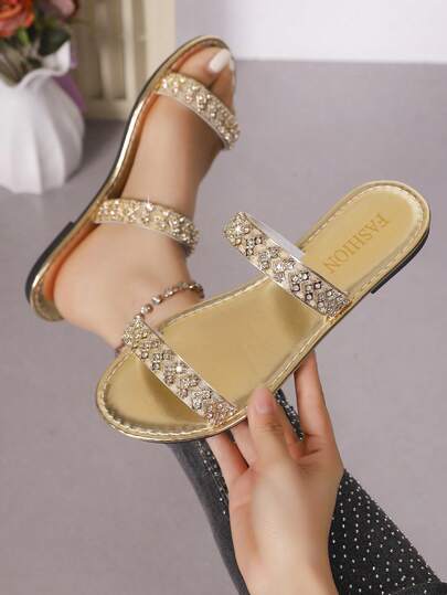 2026 Summer New Rhinestone Flat Sandals, Casual Lightweight Summer Beach Slippers, Suitable For Vacation And Daily Wear, Slip-On - Gold - View 1