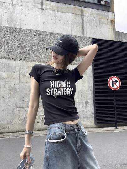 2026 Summer New Women's Fitted Short Graphic Tee, English Letter Print, Streetwear Style, Versatile Round Neck T-Shirt - Black - View 1