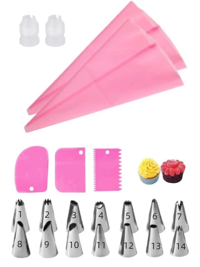 21pcs Stainless Steel Piping Nozzle & Pastry Bag & Scraper Set, Modern Piping Tool Set For Kitchen Baking - Pink - View 1