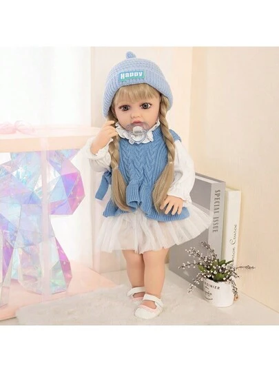 22" (Gender: Female) Realistic Silicone Baby Doll With Pacifier, Vinyl Doll, Childlike Doll, Delicate Human Figure Doll Toy, Soft Plastic Doll, Birthday Gift, Handheld Silicone Doll Comforting Tool, Gift Ivory, Fashionable Doll Dressing Toy, Suitable For Bathing, Christmas Gift - Blue Coat and White Skirt - View 1