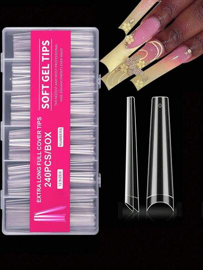 240pcs XXL Coffin Shaped Acrylic Nail Stickers, Flat Acrylic False Nails, Suitable For Nail Salons And DIY, Ideal Gift, 12 Sizes - Clear - View 1