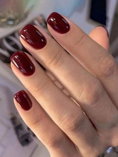 24pcs Short Square Burgundy Solid Fake Nail & 1sheet Tape & 1pc Nail File Press-On Manicure Gel Nails Kits Nail Supplies - Burgundy - View 1