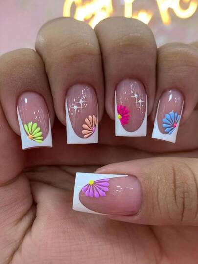 24pcs Sparkling Blue Square Shaped False Nails With 1pc Nail File And 1pc Jelly Glue Included - Multicolor - View 1