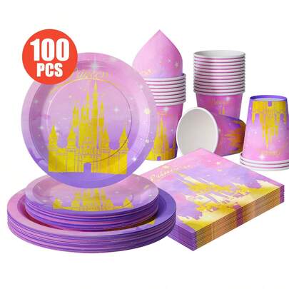 25pcs Disposable Princess Castle Theme Party Supplies Set, Including Plates, Napkins, Cups, Suitable For Birthday, Wedding, Family Picnic - Multicolor - View 1