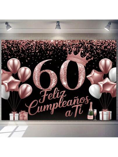 2D Flat - 1 Extra Large 60th Birthday Backdrop With Shiny Pink & Gold Balloons, Confetti, And Number 60 - Spanish Happy Birthday Party Decor (Feliz Cumpleaños) - Elegant Black & Pink Photo Background For Women, Milestone Celebration - Durable For Wall Decor, Photography & Party Decor - Easy To Install, Wrinkle-Free, Portable Roll Design - Perfect Gift - Multicolor - View 2