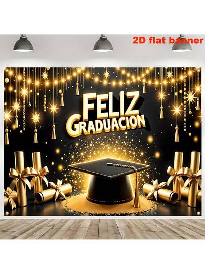 2D Flat Banner Spain Graduation Season Graduation Happy Banner Background Decoration, Golden Graduation Certificate, Bachelor's Cap Pattern Design To Celebrate Graduation, Studio Props, Indoor And Outdoor Decoration, Photo Party Decoration, Summer And Autumn - 1 - View 1