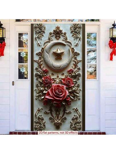 2D Polyester Ramadan Door Banner 1pc Exquisite Islamic - Inspired Wall Art With Crescent Moon, Star, And Roses Eid Al-Fitr Photo Props And Supplies, Suitable For Muslim Ramadan And Eid Al-Adha Celebrations, Islamic-Themed Holiday Decorations - 1PCS - View 1