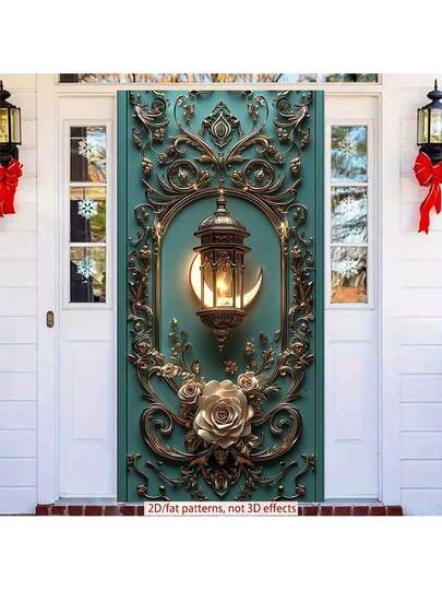 2DFlat Polyester Ramadan Door Banner 1pc Exquisite Teal Wall Decor With Golden Ornaments, A Lit Lantern And Elegant Roses Eid Al-Fitr And Supplies, Suitable For Muslim Ramadan And Eid Al-Adha Celebrations, Islamic-Themed Holiday Decorations - 1PCS - View 10